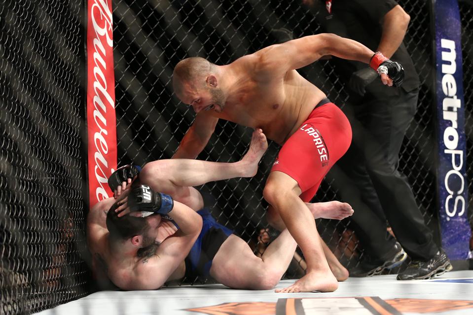 Laprise immediately applied pressure and after a number of unanswered shots to Camozzi's crumpled body, referee Herb Dean called a halt to the fight. The well-rounded showing earned Laprise one of the Performance of the Night bonuses.Laprise hadn't fought in 11 months and he'd competed at lightweight in his last fight. He looked like a skeleton at the weigh-ins to make 155 pounds.